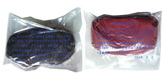 A.B电缆密封填料是一种嵌塞型的双组份胶泥。A组分:色标为黑色 B组分:色标为暗红色。将A、B两组分化合物以重量1:1均匀揉和后即可使用;揉和好的填料必须在30分钟内用完毕以防硬固;如气温过低,填料过硬施工时,可将A、B组份在揉和前分别做适当地升温处理(低于60℃),待稍软后取出使用(如连同包装袋放入热水中)。但注意A、B两组份一旦揉和,严禁加温。升温处理切忌明火直接烘烤。
